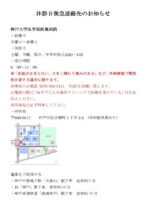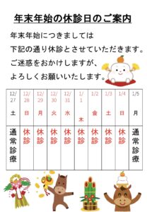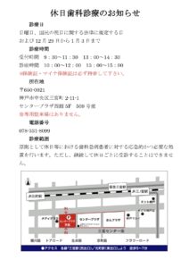 年末年始休診日のお知らせ 2025.12.15 年末年始は12/28(日)から1/4(土)まで休診とさせていただきます。 1/5(月)以降、診療を開始いたします。 ご迷惑をお掛けしますが何卒宜しくお願い申し上げます。 休診日に何かございましたら、下記の休日診療所をご受診下さい。 ↓神戸市休日歯科診療所ホームページ https://kobe418.jp/kyujitsu/